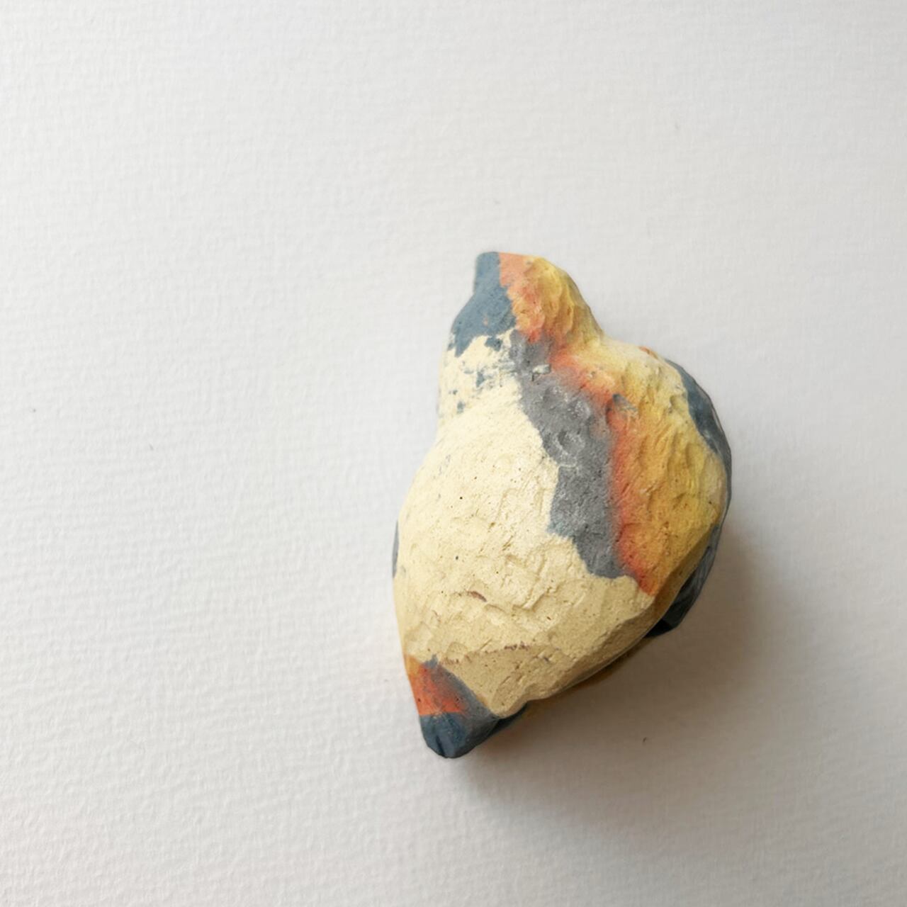 この作品は、複数の色の粘土を組み合わせ、独自の模様を生み出す練り込み技法を用いて作られています。グラデーションが施された色土を削り込むことで、美しい貝殻の形が完成しました。オリジナルの一点物です。