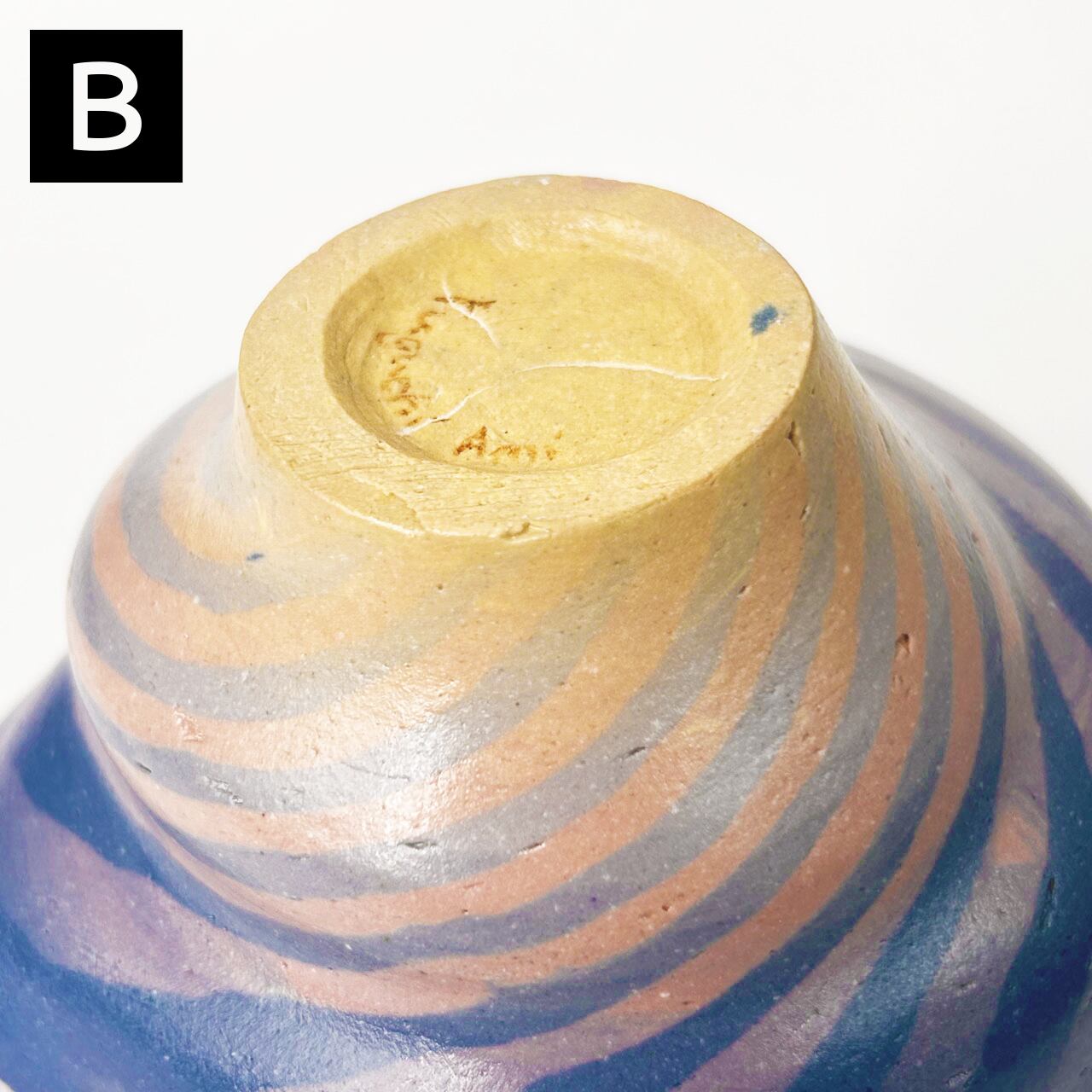 この作品は、複数の色の粘土を組み合わせ、独自の模様を生み出す練り込み技法を用いて作られています。夕方の空をモチーフに青から黄色に移り変わる中に垣間見える薄紅色がポイントです。